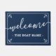 Boas-vindas a azul escuro ou a cores personalizadas a bordo do tapete de porta com o texto "bem-vindo" e o nome do barco personalizado com uma borda branca e ancoragem náutica nos cantos