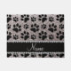 Nome personalizado moderno, moderno e personalizado feminino: brilho prateado (não brilho real) com um padrão de patas pretas de cão (impressão animal) com uma faixa bonito de pedra de rocha de diamante preto (não diamantes reais) com belos corações e pontos personalizados apenas com seus nomes, presentes de monograma ou suas iniciais. Ideal para amantes de cães e donos de animais que gostam de um pouco de bambo!