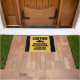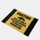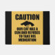 Uma silhueta de um revólver e da frase "cuidado, nosso gato tem uma arma e recusa-a tomar sua medicamentação"