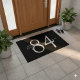Bem-vindos convidados em estilo com esta porta moderna, com um número numérico ousado de casa ao lado de um texto elegante sobre um fundo preto elegante. A fonte grande monificada e a paleta de cores minimalista em preto, branco e cinza criam uma declaração contemporânea para qualquer nova entrada de casa ou na moda. Personalize com seu próprio número e mensagem para um toque personalizado e sofisticado.