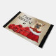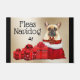 Uma ilustração adorável com aquarela de um buldogue francês sentado num saco de Papais noeis vermelhos vibrantes revestido de pelo falso e um arco vermelho vítreo aparado de ouro falso tem dois presentes embrulhados em branco e vermelho ao lado e as palavras, pulgas navidog, acima dele. O design bonito é enquadrado por um fundo dourado falso que tem duas bordas pretas verticais. Ideal para amantes do Yorkshire e acessórios da casa de Natal nesta época festiva.
