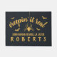 Porta do Dia das Bruxas Clássica e elegante para cair com cinzas escuras e assustadoras sobre o fundo - texto "assustador" em laranja-noz com morcegos, aranha, e seu nome familiar