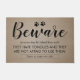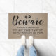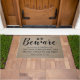 A esteira de porta engraçada do vintage que caracteriza um fundo marrom rústico do efeito de serapilheira, impressões da pata, a palavra "Beware" em uma pia batismal elegante da caligrafia, e em provérbios cómicos sobre cães em seu agregado familiar!