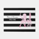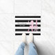 Um cabelo cor-de-rosa e preto na moda e uma esteira bem-vinda do boutique da beleza com uma silhueta cor-de-rosa de uma menina feminino que veste o rosa quente chique brilho-como calçados com arcos. Está admirando sua reflexão glamoroso em um espelho de vaidade. Personalize este design da forma alta adicionando o nome do beautician ou do hairstylist, ou informação do cabeleireiro.