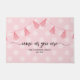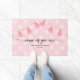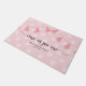 Este tapete de boas-vindas apresenta um fundo rosa divertido, um roteiro elegante de caligrafia e o nome da sua família.