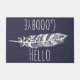 Pena tribal branca bonito boémia com as palavras "olá!" e "adeus". A cor do fundo pode ser personalizada.