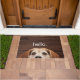 Bem-vindos aos seus convidados com uma fotografia engraçada de JoDog, o Smiling Beagle espiando-vos e a simples palavra "olá" num fundo de madeira escura. presente de excelente para o cão ou amante de os animais ou como presente para o lar. Fotografia de JoDog e design © por TK Goforward, todos os direitos reservados.