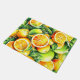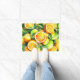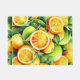 Geometric fresh oranges and lemons surrounded by lush green leaves.