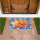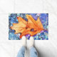 Uma bonito aquarela de uma folha de outono marrom contra um fundo de água azul.