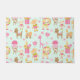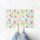 Um tapete de porta com um padrão caprichoso que inclui uma coleção de brinquedos e animais deliciosos para crianças.