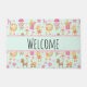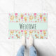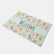 Um tapete de porta bem-vindo, com um padrão caprichoso que inclui uma coleção de brinquedos e animais deliciosos para crianças.
