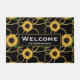 Um tapete de porta bem-vindo com um padrão elegante e na moda. Bonito girassóis amarelos e folhas verdes cercadas por delicadas cadeias de ouro. Fundo preto. Um retângulo preto com uma borda dourada com o seu dentro de texto personalizado.