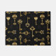 Padrão perfeito de chaves antigas, douradas e silhuetas em fundo preto.