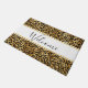 Uma porta de boas-vindas com um padrão de na moda. Manchas negras negras exóticas num fundo de ouro. Um estilo selvagem mas elegante. Um quadro retangular branco com uma borda dourada colocada sobre cima com dentro de boas-vindas.