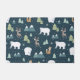 Um tapete de porta com um padrão festivo caprichoso. Ursos polares, renas, árvores, raposas e flocos de neve. Num fundo verde escuro.