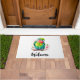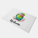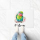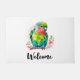 Uma porta de boas-vindas com uma ilustração fofa de papagaio. Um pequeno papagaio verde com cores azuis e amarelas se misturando. O pescoço tem um tom vibrante de rosa avermelhado.