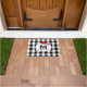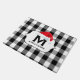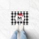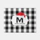 Pré-disquete, xadrez de búfalos de tendências, preto e branco personalizado porta de boas-vindas de Natal - Padrão clássico de xadrez de lenhador em cheques a preto e branco com nome de família personalizado e monograma preto no centro. Bonito chapéu de Papai Noel está empolgado na carta inicial. Boas-vindas de férias para os convidados em frente a uma cabana acolchoada durante o Natal ou a decoração pré-escolar para o período de férias. Gato de campo, presente de Natal monograma para a família ou presente de chá de casamento de Natal único para os recém-casados.