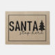 Papais noeis Param Aqui com a Porta da Árvore de Natal. Fundo de textura de canvas de burlap.