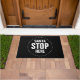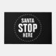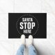 Papais noeis Param aqui decorações engraçadas engraçadas brancas e pretas de porta cercadas por uma delicada coroa redonda de flocos de neve fofinhos