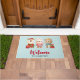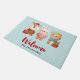 Uma porta bem-vinda com uma ilustração fofinha com um coelho, um urso e um veado todos vestidos de engrenagem festiva. Adorável e caprichoso.
