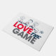 Confira Charlie Brown, Franklin, Peppermint Patty, e Snoopy correndo e jogando futebol juntos de uniforme, sobre as palavras: "Love The Game".