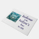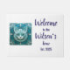 Porta branca impressa com um azulejo de gato azul teal inspirado nos azulejos do Art Nouveau, personalizado com seu nome de família e data de estabelecimento. Perfeito como presente para uma festa de inauguração.