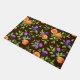 Cenário botânico verde e fruta, pêssegos e ameixas com folhas verdes. Pêssegos laranja e vermelho, ameixas azuis e roxas escuras e ameixas magenta. Pop de cores sobre fundo escuro. Padrão bonito, brincalhão e ousado.