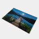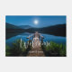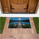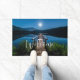 Uma porta bem-vinda com uma bela fotografia de um píer de madeira esticando-se sobre um lago calmo. O céu noturno coberto de estrelas e uma bela lua de cheio.