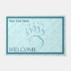 Uma renderização digital simples, em tons azuis, de uma pegada de Urso Polar no conjunto de gelo do Ártico. O texto "WELCOME" também é exibido. Você pode adicionar seu próprio texto. O Urso Polar (Ursus maritimus) está cada vez mais ameaçado. Por favor, façam o que puderem para limitar a vossa pegada de carbono para que os ursos possam continuar a deixar as suas impressões na neve e no gelo.