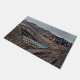 Paisagem de montanha do sol com picos fluidos de rio e montanhas ao amanhecer ou ao pôr do sol. Ilustração de abstrato estilizada com padronização de arte de linha em estilo de tanga dúctil.