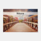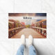 Uma porta de boas-vindas com uma fotografia cênica. Uma ponte de madeira em direção a um caminho rodeado por árvores florestais mudando de cor.