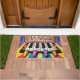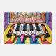 Uma porta engraçada em forma de um teclado de piano com 4 pés para fora. A porta é colocada em frente a uma porta com uma janela que mostra uma paisagem urbana ao fundo. Bem-vindos aos seus entes queridos com este estilo - Incrível Design de Chaves Piano Coloridas para Seus Pés Antes de Entrar na Porta.