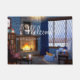 Um canto aconchegante num dia de inverno nevado, com um gato gengibre sentado olhando para o fogo brilhante. Ao redor da lareira estão cadeiras-de-braços suaves, com velas brilhantes e pilhas de livros e uma caneca a vapor para completar o conforto. Fora de um salgueiro coberto pela geada, a cobertura de faia é obscurecida pela queda da neve.