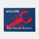 Maleta de boas-vindas com design de lagosta vermelha. Faça o seu próprio formato monograma personalizado de porta interior/exterior com cor de fundo e texto personalizados. Adicione sua própria mensagem de boas-vindas, nome da família, sobrenome, letra inicial ou citação engraçada. Bela ideia de presente para novas casas/abrigos, locais de casamento, loja, compro de peixes, escritório da empresa, negócios etc. Modelo de tipografia de safra. Crie seu próprio tapete/tapete de entrada exclusivo para porta frontal/entrada ou hall. decorações/decorações caseiras personalizáveis para a casa de praia náutica. Ideia legal de presente marítimo para o entusiasta da navegação/barco, casal, marinheiro, capitão de barco ou recém-casados. Marinho azul e vermelho.