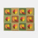 Quatro quadrados são decorados com folhas e abóboras em tons de outono de vermelho, laranja, amarelo e marrom. A costura branca adiciona um toque decorativo, dando ao padrão repetitivo a aparência de uma colcha, criando um sentimento perfeitamente aconchegante para o outono.