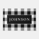 Um tapete de porta frontal que apresenta o padrão clássico de xadrez de búfalos preto e branco com espaço para personalizá-lo com seu próprio sobrenome.