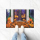 Uma porta de um Feliz Festa de Halloween cumprimenta convidados em uma casa assustadora com abóboras, morcegos e decoração festiva visível por toda a varanda e janelas. Bem-vindos aos seus entes queridos em estilo com esta mensagem de Feliz Dia das Bruxas. Design Para Seus Pés Antes De Entrar Na Porta.