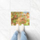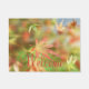 No cenário das folhas verdes de verão de um ácer japonês que fluía para vermelhos e amarelos do outono, uma folha de esqueleto de rosa e ouro desce lentamente para o chão.