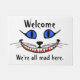 A porta com a imagem de Cheshire Cat de Alice no País das Maravilhas com as palavras, "Bem-vindo, estamos todos zangados aqui".