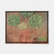 Vários topiários em potes de terra no topo dos livros. O fundo é um marrom antigo.
