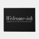 Um tapete de porta preto e branco. "Bem-vindo (depende de quem você é e quanto tempo você fica)" design simples com um pouco de bunda para adicionar à sua decoração.