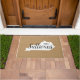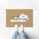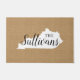 A casa de fazenda moderna personalizou a porta com seu nome de família dentro no mapa do estado. Fundo de textura de canvas de burlap. Clique em Personalizar para adicionar seu próprio texto e imagens e criar um único design!