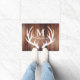 Etapa até no chique da fazenda! Este doormat de madeira marrom profundo, rico, rústico das pranchas do celeiro tem uma silhueta branca torrada dos antlers dos cervos e sua letra personalizada do nome e do monograma de família. Termine fora sua casa da quinta com este grande doormat para cumprimentar seus convidados.