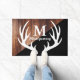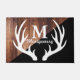 Profundamente, ricos, pranchas de madeira marrons rústicas do celeiro com uma silhueta branca torrada dos antlers dos cervos, diagonal moderna preta, e sua letra personalizada do nome e do monograma de família.