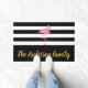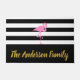 Avise seus visitantes que chegaram na casa certa. Você pode adicionar o nome de sua família em um roteiro de ouro falso na faixa preta larga na parte inferior. O fundo é listras brancas e pretas. Um flamingo rosa está acima do texto.