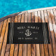 Bem-vindos convidados para o seu barco de pesca, veleiro, iate ou barco doméstico com esta charmosa porta náutica. O design personalizado apresenta o nome do barco, o registro do navio e o ano estabelecidos em caracteres neutros que não em letras com uma ilustração de âncora. A faixa de cordas detalhando sobre um fundo preto rico completa a design.