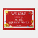 Dê as boas-vindas aos convidados à sua primeira casa com este alegre design rústico vintage que cria a sensação perfeita na porta da frente, entrada ou varanda. Esta encantadora composição apresenta girassóis amarelos brilhantes, pássaros azuis felizes, galinhas fofas, uma casa de passarinho rústica e um avião vintage caprichoso contra um fundo clássico vermelho e branco com borda.