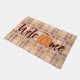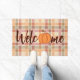 Porta do estilo moderno de casa de campo com abóbora de laranja fofa. Boas-vindas, texto de citação do wordart em um padrão de verificação de xadrez de gingham cor de laranja quente na temporada de outono.