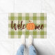Porta do estilo moderno de casa de campo com abóbora de laranja fofa. Boas-vindas, texto de citação do wordart em um padrão de verificação de xadrez de gingham verde na temporada de outono.