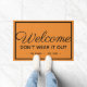 Dar boas-vindas calorosas e engraçadas aos seus hóspedes com este design de tapete de porta personalizado. Design tem um olhar de um simples tapete de boas-vindas até ler de perto que desencoraja os hóspedes de sobreviverem à sua visita. As palavras "bem-vindos não vistam" com o nome da família e a data final. Design apresenta um fundo laranja de abóbora com caligrafia preta e caracteres modernos. Uma borda negra cobre as letras no tapete. Design por © Ms_Jade. Compre outros designs divertidos na minha loja Zazzle em www.zazzle.com/Ms_Jade*